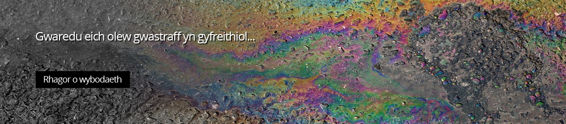 Yn 2012 hysbyswyd asiantaethau amgylcheddol y DU am fwy na 3300 o ddigwyddiadau yn ymwneud â llygredd olew. Mae hynny bron yn 10 digwyddiad bob dydd. Mae olew’n niweidio’n hamgylchedd, yn lladd planhigion ac anifeiliaid, yn edrych yn hyll a gall gostio miloedd o bunnoedd i’w lanhau.